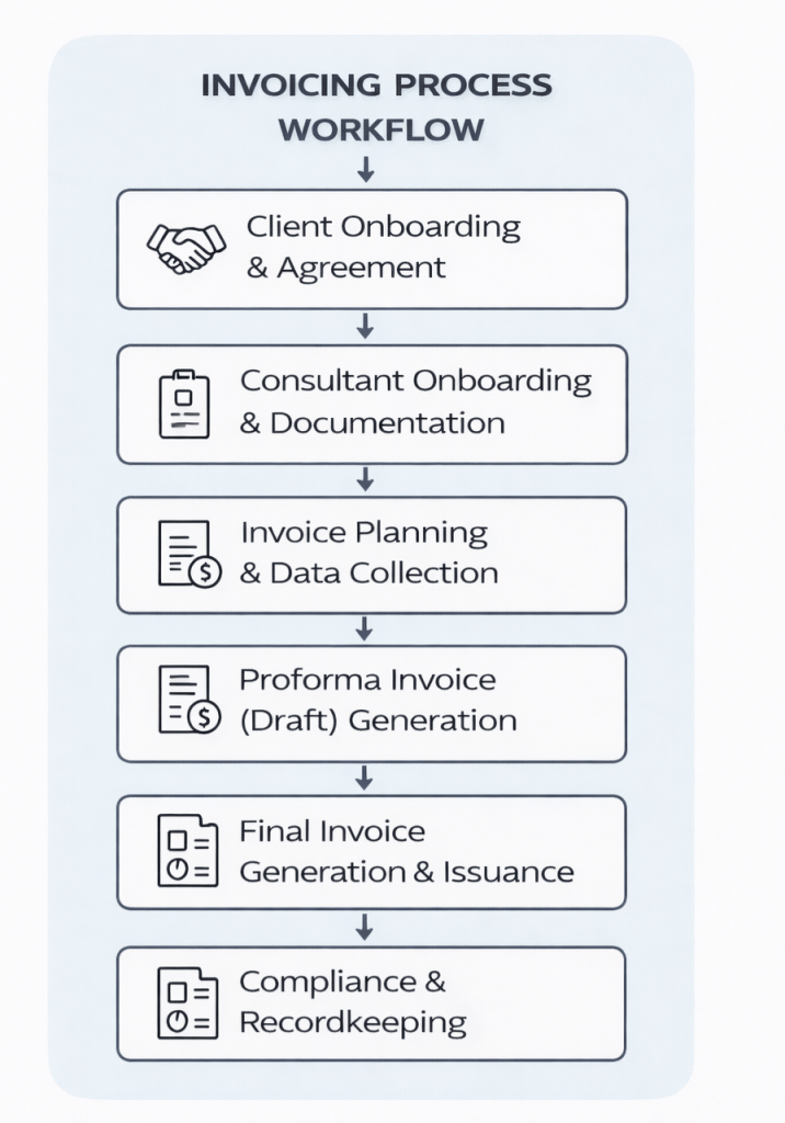 The flowchart below outlines how the invoicing workflow was designed to cover the entire process – from onboarding to compliance – rather than focusing only on invoice preparation.